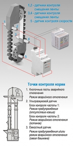 | Устройство контроля норииУстройство контроля нории предназначено для блокировки привода транспортера (нории) или конвейера и сигнализации: