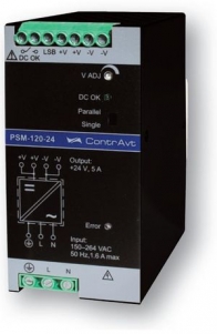 Импульсные блоки питания (источники питания) PSM-120-24 преобразуют сетевое переменное напряжение в широком диапазоне значений 150-264 В (постоянное 240 -370 В) в стабилизированное постоянное напряжение 24 В с током нагрузки до 5 А. Диапазон рабочих температур блока питания -30...+50 °С. Монтаж на DIN-рельс.