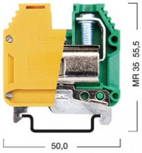 Надежный механический и электрический контакт с монтажной рейкой обеспечивается простым защелкиванием и затягиванием. Малое переходное сопротивление, защита от корозии и в местах присоединения проводников, желто-зеленый цвет корпуса клеммы, возможность нанесения маркировки.